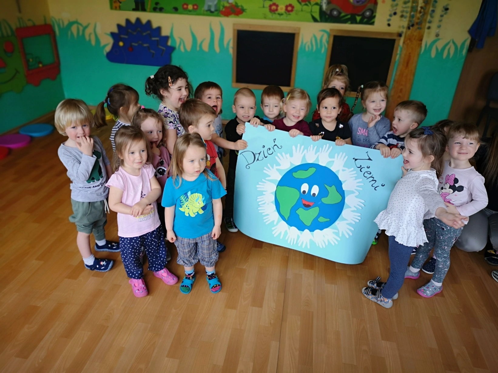 Wychowankowie zapoznali się na wstępie z modelem Ziemi, wykonali wspólną pracę plastyczną oraz indywidualne w tematyce ekologii.