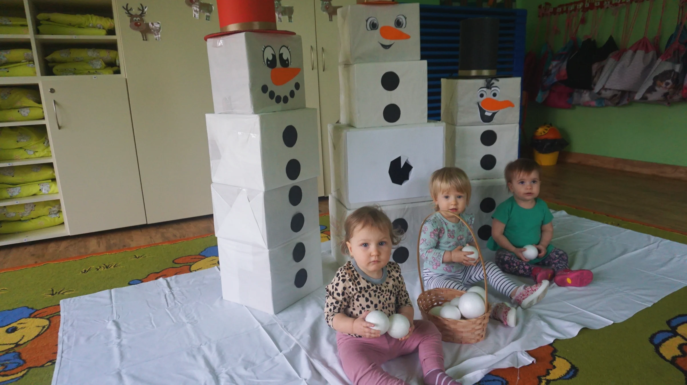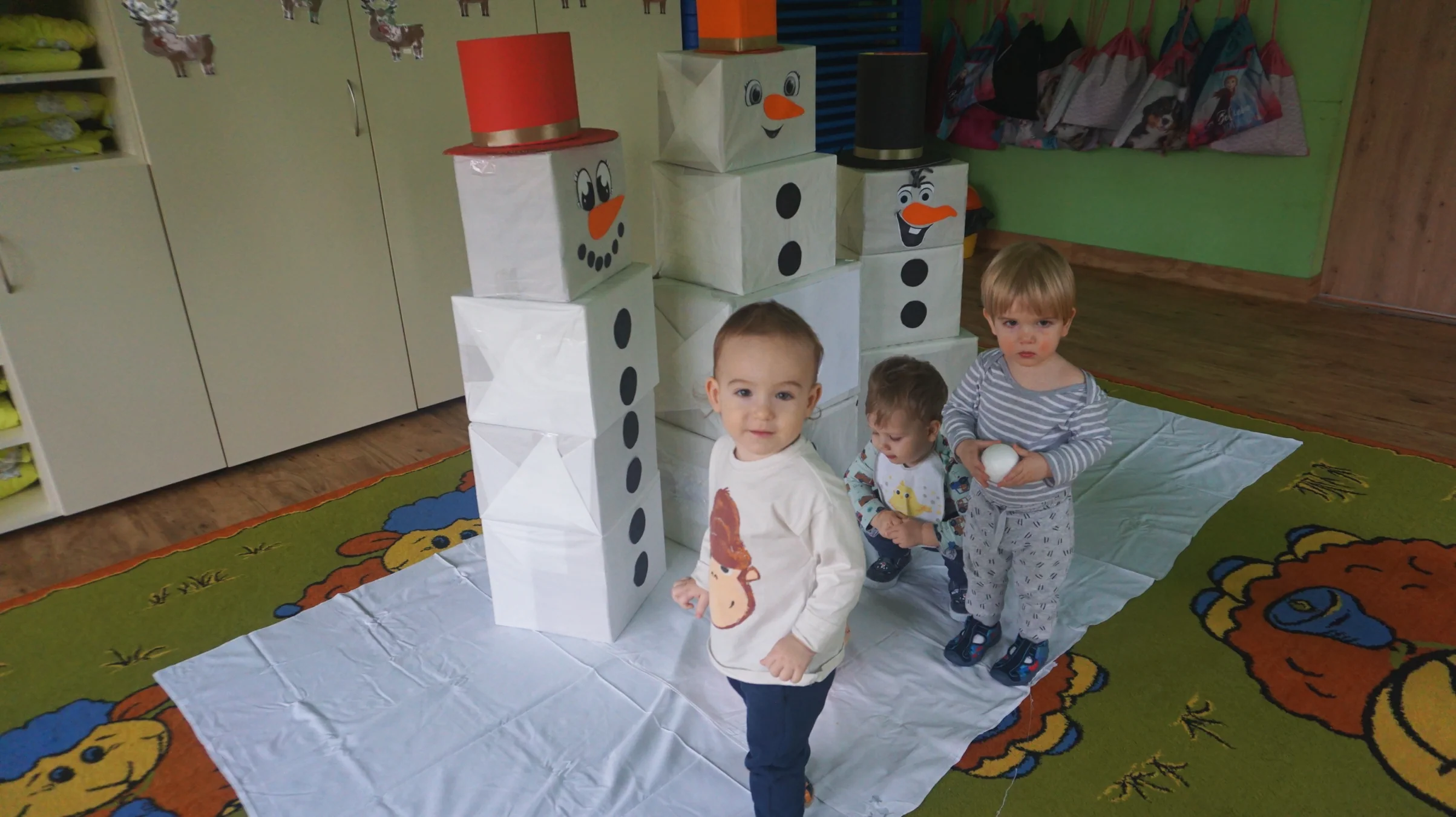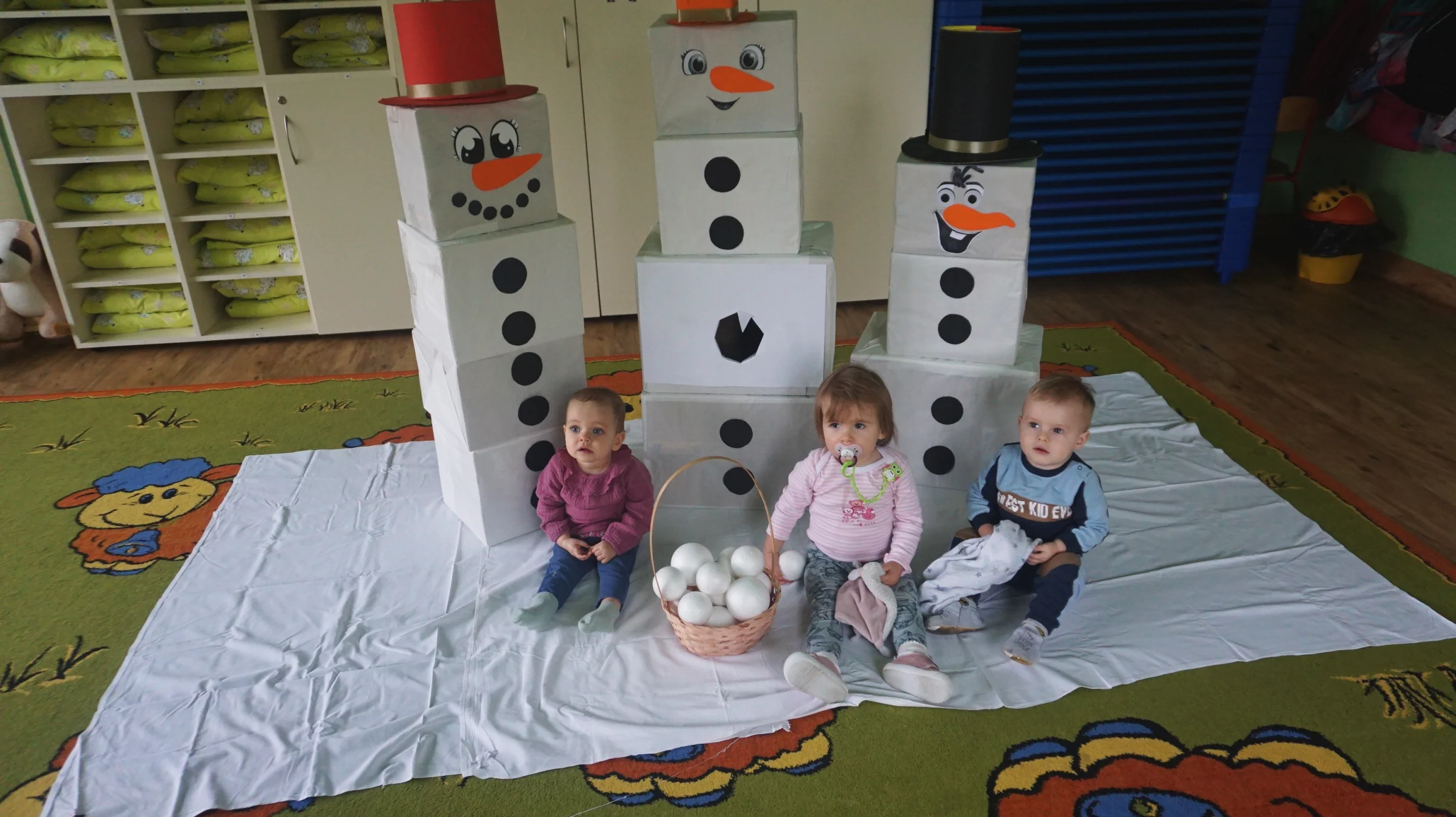 Chociaż niektóre dni nie przypominały zimy, to my w grudniu bawimy się „na zimowo”. Jesteśmy przygotowani do zimy. Dzieci ubrały ciepłe szaliki i czapeczki. Są też zabawy z bałwankiem na brystolu.